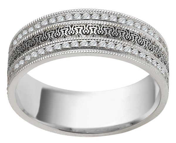 18kt white gold, 5.5mm wide, comfort fit, Verona Lace design, diamond eternity wedding band. The wedding band holds 114 round brilliant cut diamonds each 0.005ct . The diamond total weight in size 6 is approximately 0.57 ct. The diamonds are graded as VS1-2 in clarity and G-H in color.