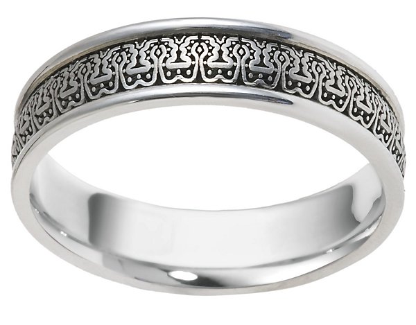 14kt white gold, 6.0mm wide, comfort fit, Verona Lace design wedding band. See V11472W for matching ladies' ring.
