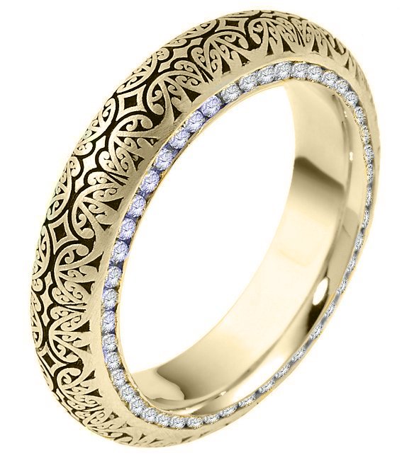 18kt gold, 5.5mm wide, comfort fit, Verona Lace design, diamond eternity wedding band. The wedding band holds 92 round brilliant cut diamonds each 0.005ct.The diamonds are set in channel on both side of the ring. The diamond total weight in size 6 is approximately 0.46 ct. The diamonds are graded as VS1-2 in clarity and G-H in color. Please see V11475 for matching Men's ring.