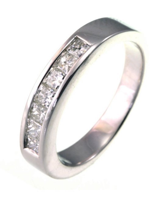Platinum, comfort fit, approximately 3.5 mm wide 7 princess cut diamonds, anniversary band. Diamonds together weigh approximately 0.50 ct and are graded as VS in clarity H in color. The finish on the ring is polished. Other finishes may be selected or specified.