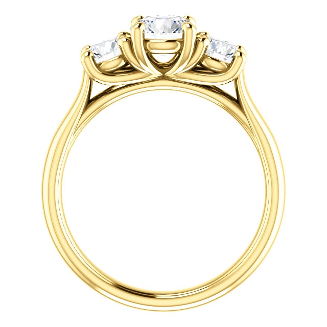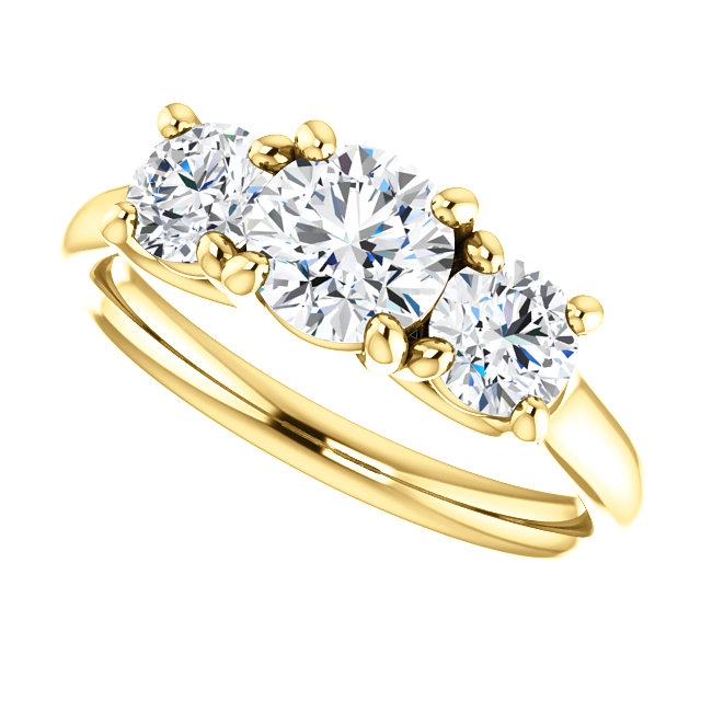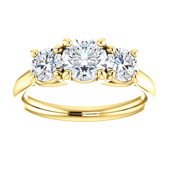 One 14 K yellow gold, three diamond anniversary band. Diamonds together weigh approximately 1.50 ct and are graded as VS2 in Clarity H in color. Center diamond is 0.75ct. All diamonds are are certified by GIA. The finish on the ring is polished. Other finishes may be selected or specified.