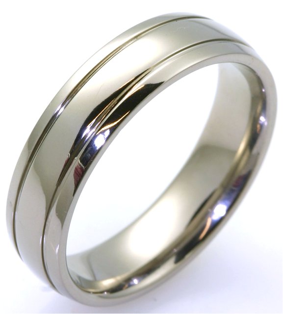 Domed polished titanium ring with dual offset grooves - 6mm wide. Available between size 8 to 13 in half size increments