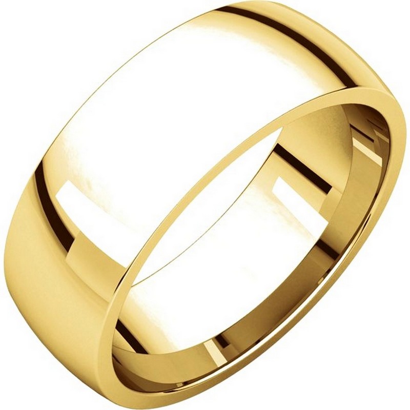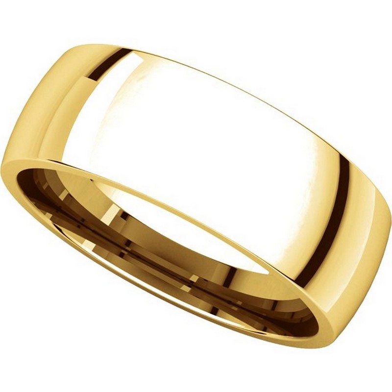 14K gold, comfort fit, 7.0 mm wide, plain wedding band. The finish on the ring is polished. Other finishes may be selected or specified.