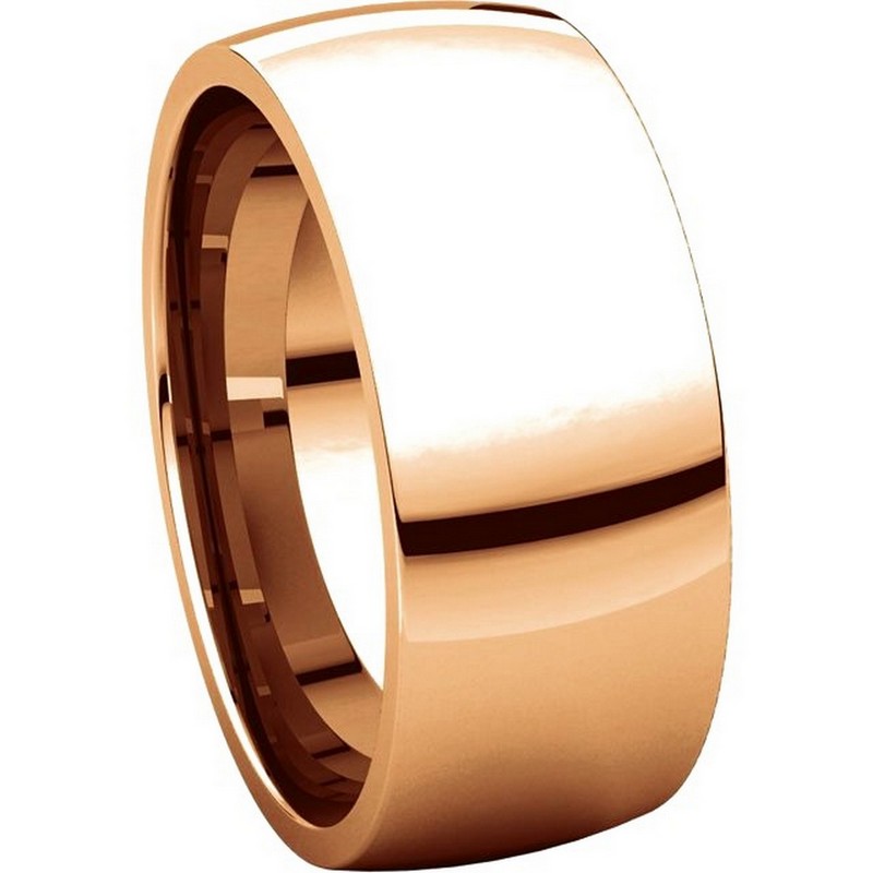 14K Rose gold, 8.0 mm wide,  comfort fit, wedding band. The finish on the ring is polished. Other finishes may be selected or specified.