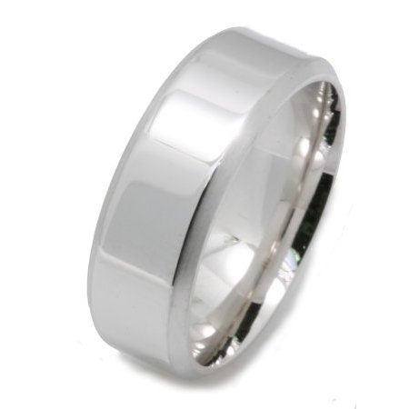 18K white gold, comfort fit, 8.0 mm wide wedding band. The edges are beveled with a matte finish and the center is polished. Other finishes may be selected or specified.
